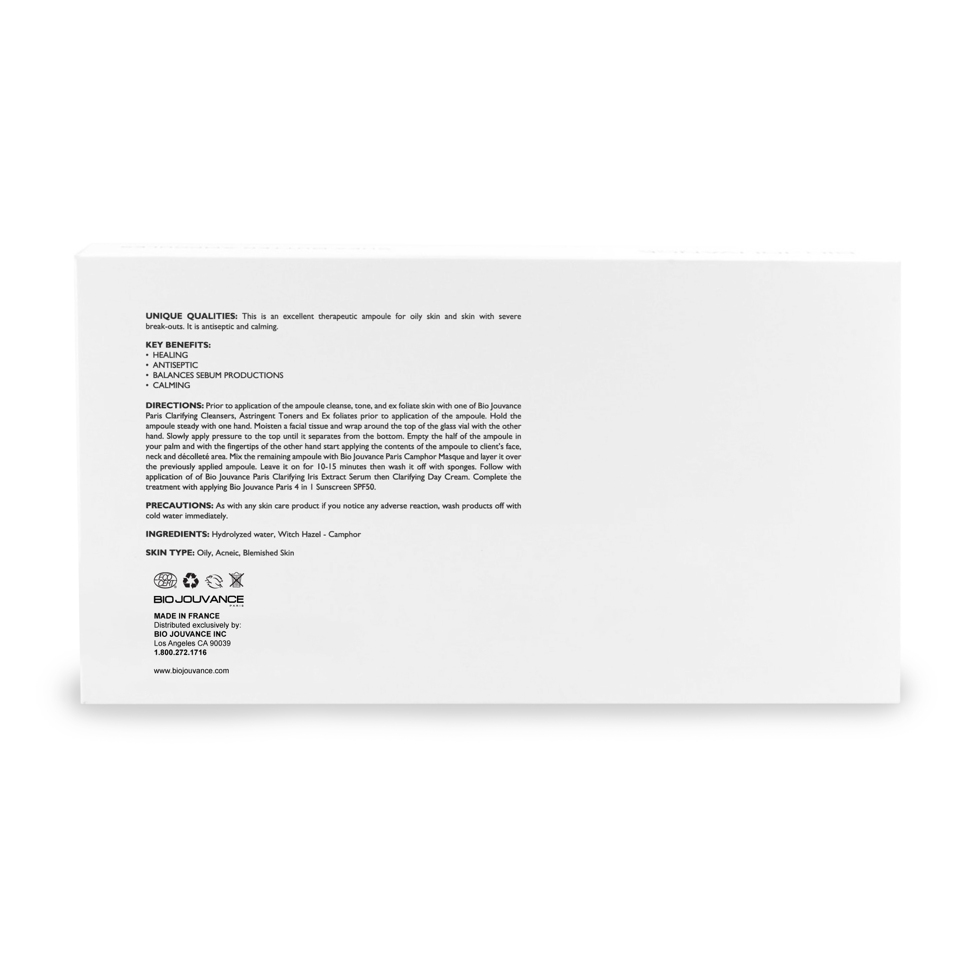 This is the ampoule for oily, breakout-prone skin that needs fast, visible clearing. Most acne treatments either dry skin out completely or are too gentle to make a real difference. Camphor delivers potent antibacterial action without disrupting the moisture barrier, and Witch Hazel provides astringent pore-tightening through natural tannins rather than harsh synthetic alcohols. Bio Jouvance Paris formulated this for the treatment room moments when a client sits down with active, inflamed breakouts that need immediate attention. When breakouts need to go — not gradually, but now.